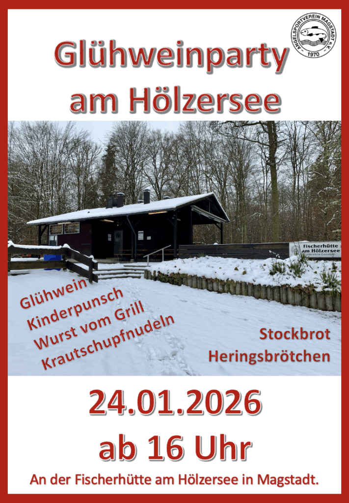 Am 24.01.2026 laden wir ab 16 Uhr herzlich zu unserer traditionellen Glühweinparty an der Fischerhütte am Hölzersee ein. Für das leibliche Wohl ist bestens gesorgt: Neben Glühwein und Kinderpunsch erwarten Sie Krautschupfnudeln, Grillwürste, Stockbrot und Heringsbrötchen. Wir hoffen auf winterliches Wetter und freuen uns sehr auf Ihren Besuch.